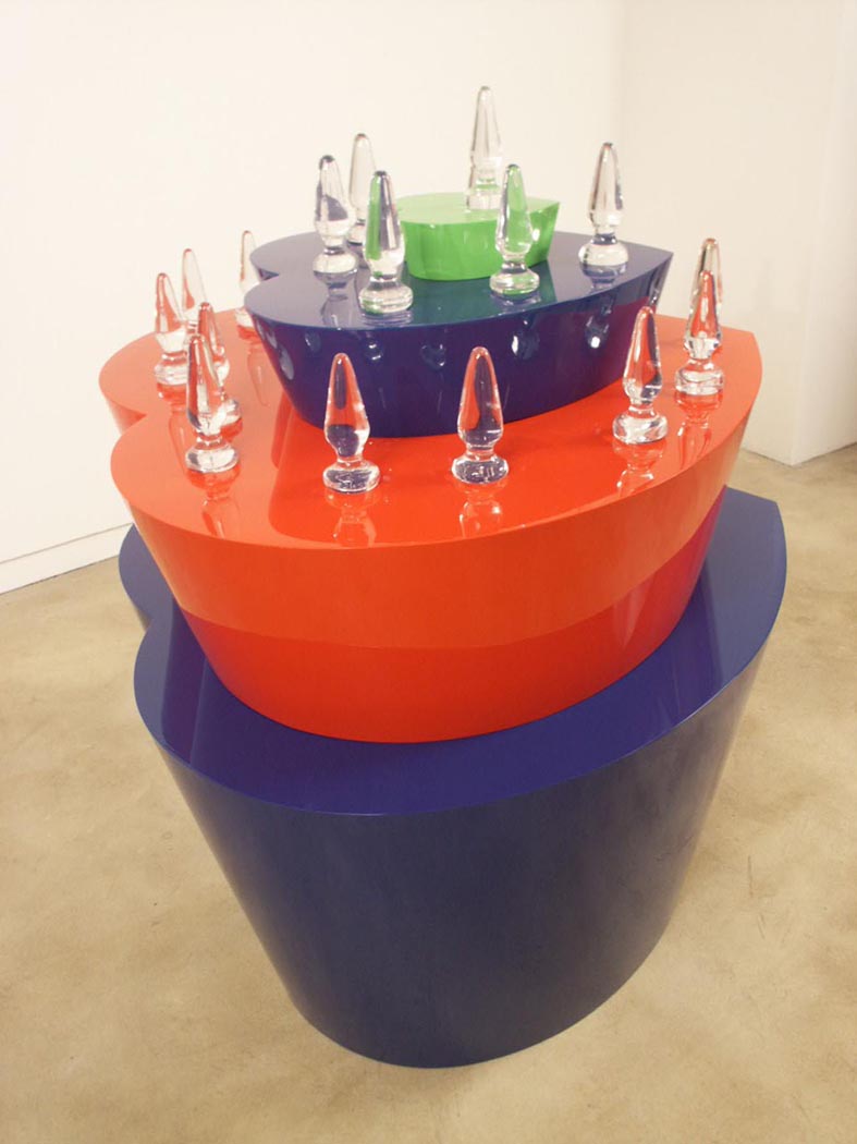 | Florence Loewy a inauguré son nouvel espace avec une exposition de General Idea du 20 octobre au 22 décembre 2001. À cette occasion fut présentée la Boutique Cœurs Volants (1994-2001), sculpture composée de quatre éléments en aluminium laqué et de 24 butt plugs en verre transparent. La Boutique Cœurs Volants est un des projets non réalisés et conçus à l’époque de la mort de Jorge Zontal et Felix Partz, qui fut une période d’intense production, le groupe luttant contre le temps et la maladie pour achever les œuvres en cours. Cette boutique fait partie d’une série de fausses boutiques inaugurées en 1969 avec la Belly Store, suivie par la Boutique from the Miss General Idea Pavillion en 1980 et la Yen Boutique en 1991. Ces œuvres fonctionnaient comme des boutiques de musées, proposant à la vente l’extraordinaire production de multiples et publications du groupe. |